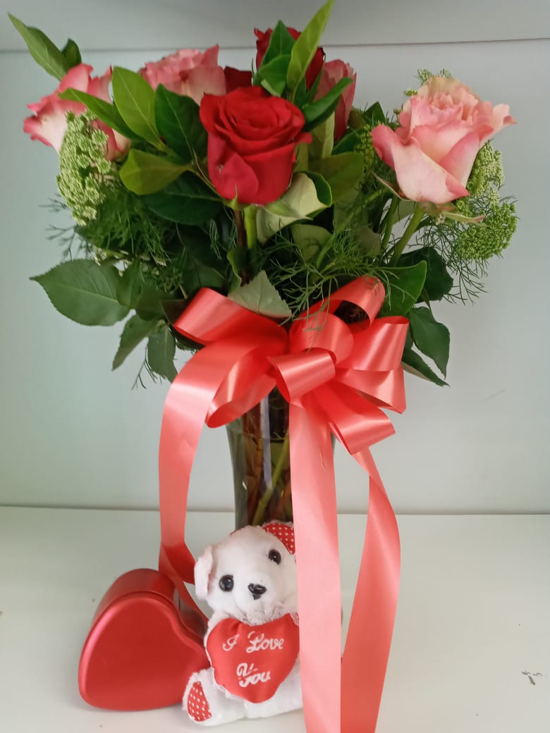 Red and pink roses in glass vase with heart tin of sweets and teddy bear